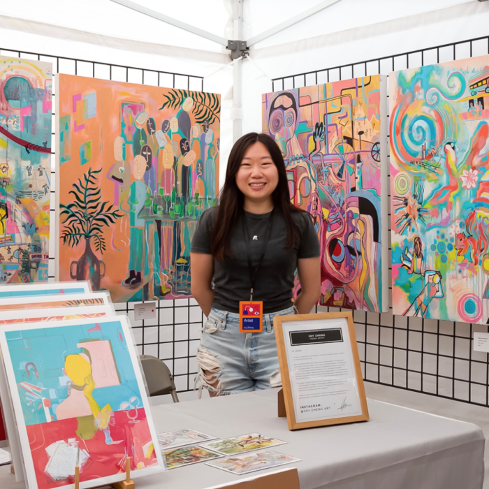 Joy is a Toronto-based artist, creating vibrant, eclectic oil and acrylic paintings. She graduated from Western University with a Bachelor of Fine Arts, where she began developing her style and thematic focus. Her inspiration often draws from the way perceptions of the world shift at various stages of life, exploring themes of introspection, and self-dialogue rooted in personal experience. Many of her works intentionally incorporate a childlike element, using vivid colour palettes, and deliberately chaotic, disproportionate compositions. Through this seemingly playful lens, Joy examines social constructs and the complexity of human emotions.